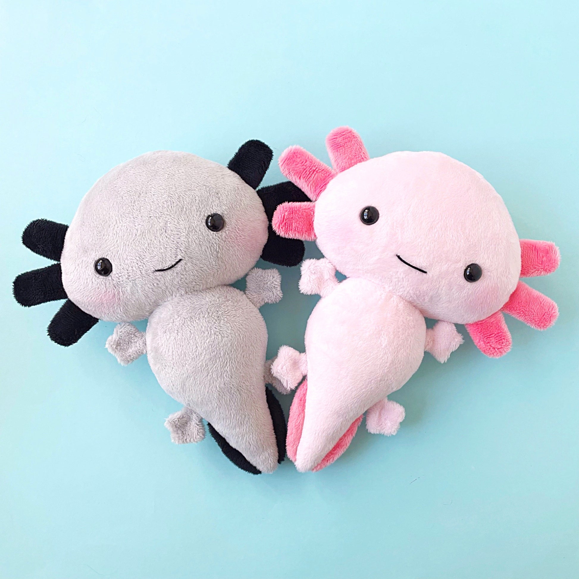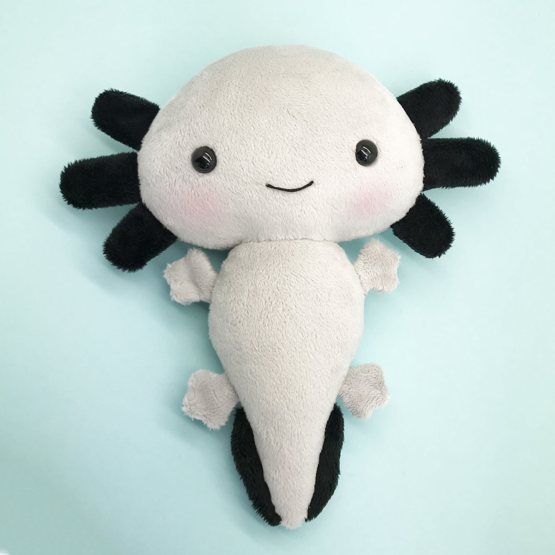 This cute axolotl is handmade of the softest light gray minky fabric, which makes him irresistible for big cuddles and stuffed with hypo allergenic stuffing.