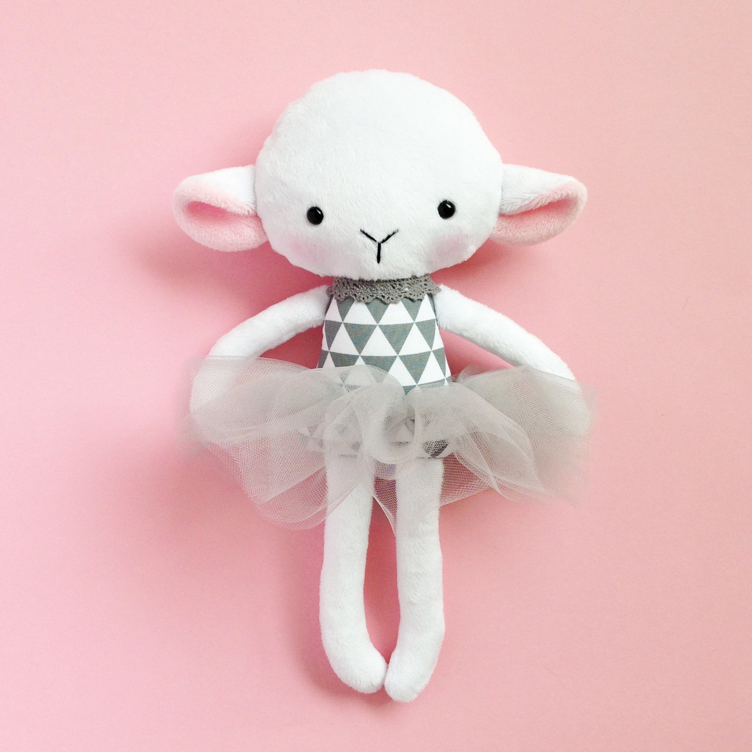 She's made of very soft minky fabric, cotton and tulle and stuffed with an anti allergenic stuffing.